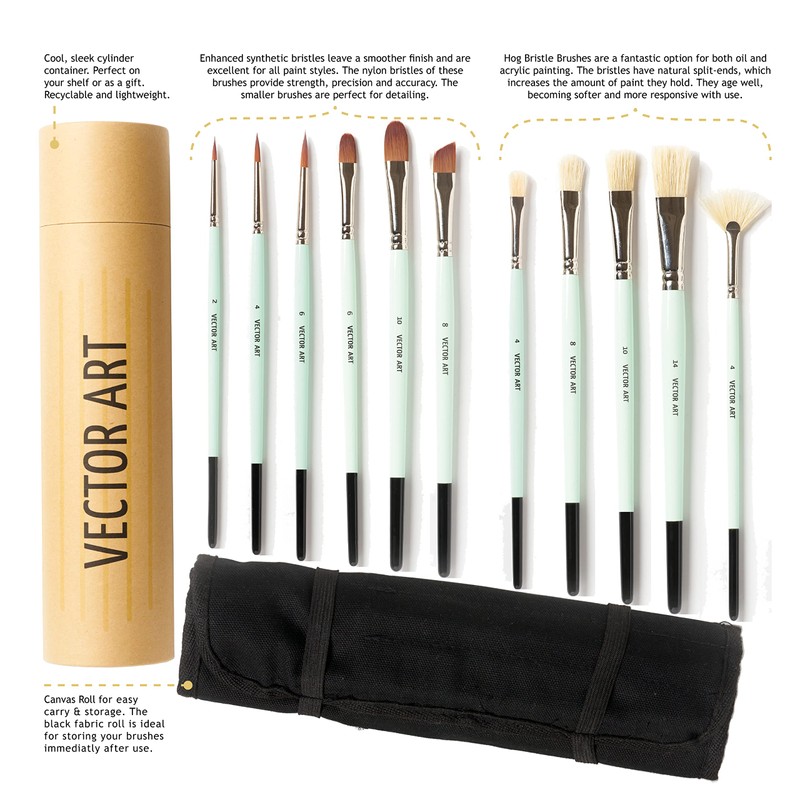 - CHIC AND STYLISH: Vector Art has created this set with both style and practicality in mind. The set is delivered in a cool card cylinder container which has a superior feel and quality to it. We did not want to use any plastic in our design because we care about the planet, so all the packaging is 100% recyclable. Inside you will find the canvas roll which holds your 12 elegant brushes. The canvas roll is perfect for keeping your brushes dry and clean.