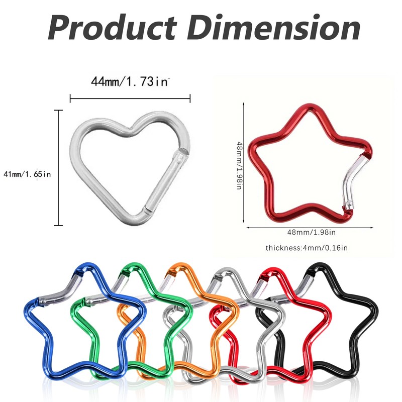 - STAR HEART CARABINER: You will receive 12 pieces of star and heart carabiners in 6 colours (black, silver, gold, red, green, blue), 2 pieces of each colour. Smooth and shiny polished finish, small and portable, choose the right carabiner for your outfit when you go out.