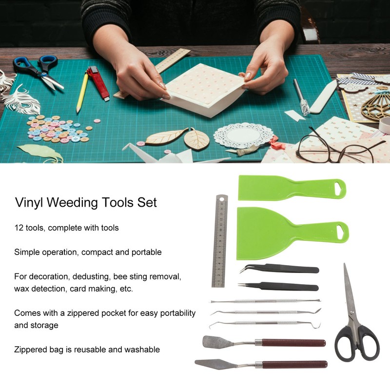 1、Multipurpose: Vinyl weeding tools can be used for decorating, chipping, bee sting removal, scrapbooking, wax carving, wax inspection, card making, crafting and more. 2、Complete Tools: Vinyl weeding tools set contains 12 tools, complete tools to meet various needs. 3、Durable Materials: Craft vinyl weeding tools are made of stainless steel, plastic, synthetic wood, cloth,wear resistant and durable for long term use. 4、Storage Bag: Vinyl weeding tools comes with a zippered pocket for easy portability and storage, the zippered pocket is reusable and washable. 5、Easy to Use: 12 Pcs weeding tools are easy to operate, compact and portable, easy to carry around.