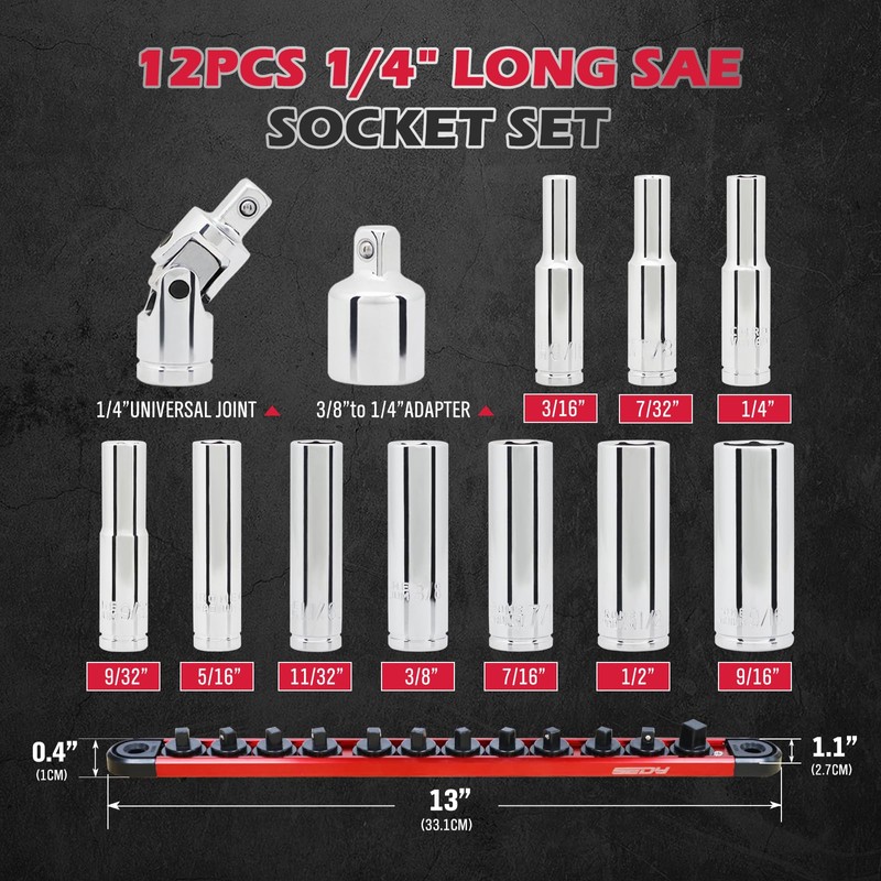 12-Piece 1/4" Drive SAE Long Socket Set 3/16" - 9/16" with 1 Piece Magnetic Organizer Rail Rack, Premium 6-Point Deep Socket Assortment with 3/8" to 1/4" Adapter and 1/4" Universal Joint (Red)