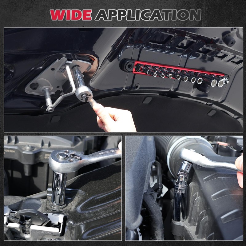 - BROAD COMPATIBILITY – This socket set includes the most common socket sizes and a 3/8" to 1/4" adapter and 1/4" universal joint, offering versatile compatibility for a wide range of automotive applications. A must-have for mechanics, enhancing tool versatility in your tool kit