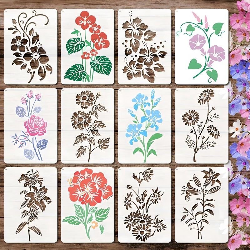 Pack of 12 large flower stencils set (21 x 29.7 cm), stencils for wall design, reusable spring stencils for painting for DIY, furniture, floor, scrapbooking, textile design and crafts