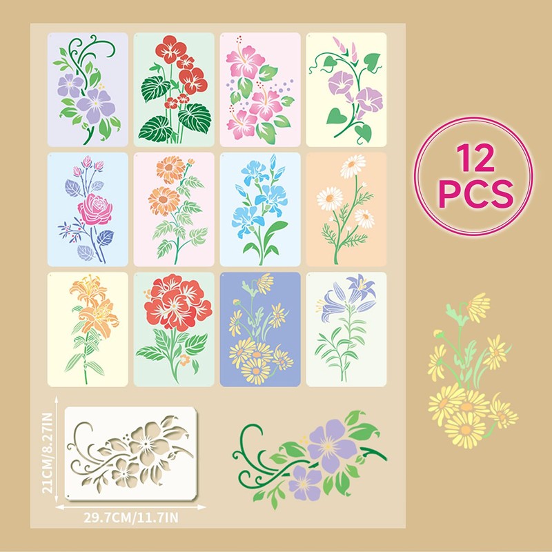 12 Piece Large Flower Stencil Set (21 x 29.7 cm), Stencils for Wall Design, Reusable Spring Stencils for Painting for DIY, Furniture, Floor, Scrapbooking, Textile Design & Crafts