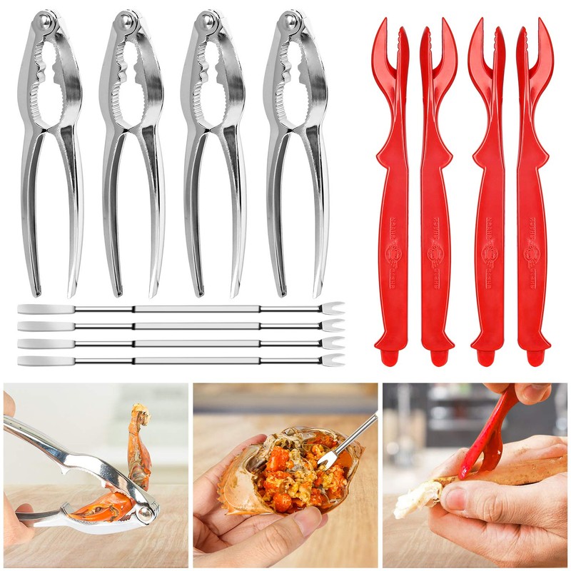 - 12 PCS Seafood Tools Set - Professional seafood tools set includes 4 zinc alloy nut crackers,4 Food-Grade plastic lobster Crackers shellers, 4 stainless steel crab leg forks/picks,and 1 flannel bag. Our versatile crab kit is a great gift for anyone who loves seafood and a must-have in our kitchen, restaurant party or picnics tool.