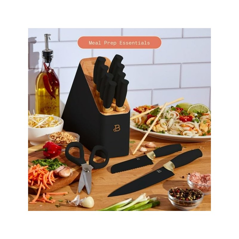 12 Piece Stainless Steel Knife Block Set, Soft-Grip Handles Black by Drew Barrymore, STICK RESISTANT