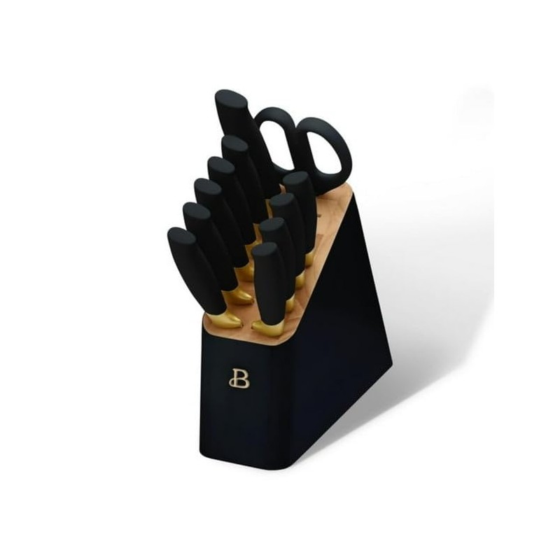 Purposeful tools create purposeful kitchen moments. The 12 Piece Knife Block Set features a variety of knives and all-purpose shears to slice, dice, mince, cut, and more. Innovative knives and scissors feature blacksoft grip handles with our signature gold accents that fit comfortably in your hand. Durable stainless steel blades feature a stick resistant, resin coating that limit food from adhering to the knife and allow for easier, more efficient cutting.