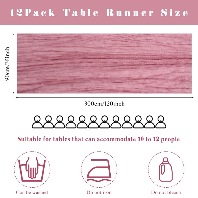Table Runner Package:The package contains 12 cheesecloth table runners, which is sufficient to meet your daily use and replacement needs.