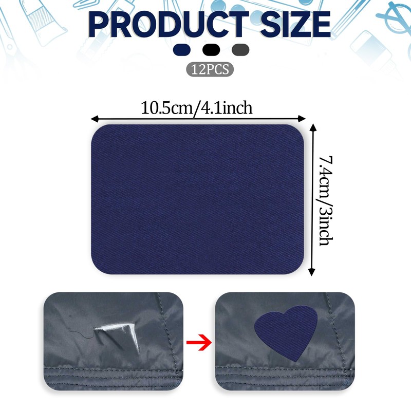 - 【Multiple Colors】The iron-on patch kit contains 12 patches measuring 10.5 x 7.5 cm, including three colours: black, navy blue and dark grey, sufficient quantity and different colours to meet your long-term use needs.