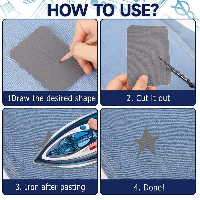 - DIY design: You can use these patches to repair holes and tears in jeans clothes or trousers, or you can cut these fabric pieces into your favourite shapes to decorate your clothes. You can let your imagination run wild to create DIY designs.