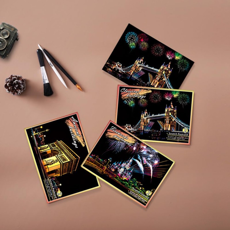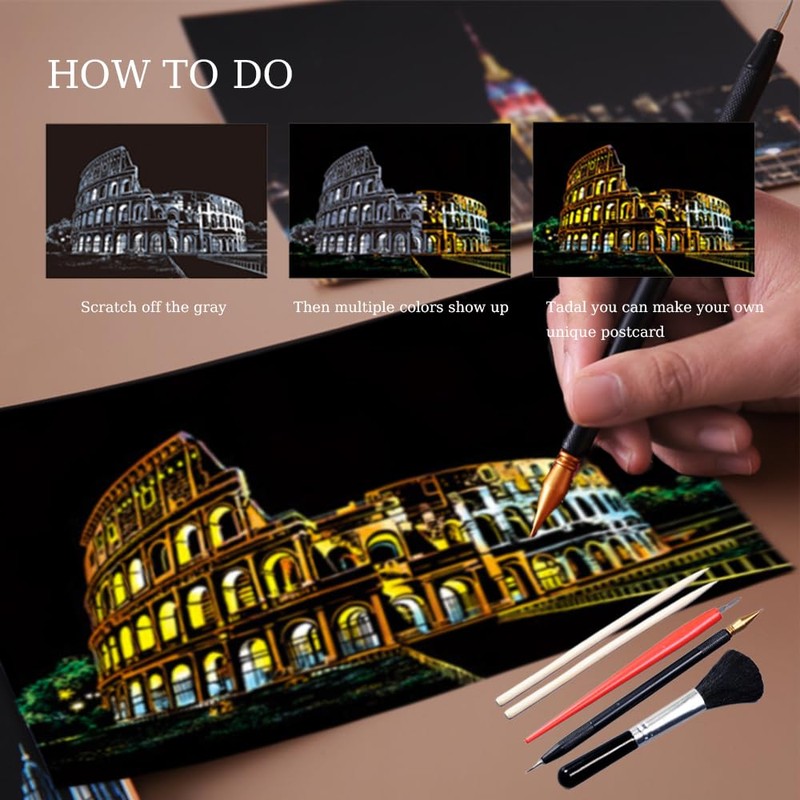 • PACKAGE INCLUDES Set of 12 rainbow scratch art papers with city night scenes, complete with 5 professional scratch tools for detailed artwork