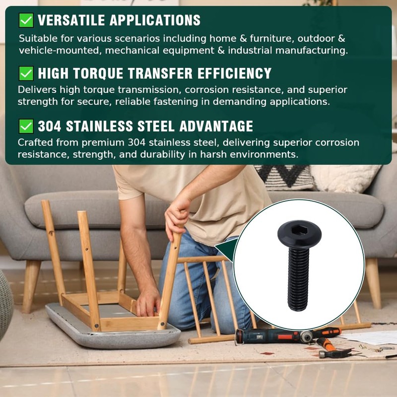 - Material: Constructed from 304 Stainless Steel with a durable black coating. This combination delivers superior corrosion resistance and strength compared to standard 304 stainless steel or zinc-plated fasteners; Ideal for harsh environments—including high temperature, freezing conditions, and high humidity—it requires no costly or time-consuming maintenance; The fade-resistant black finish ensures lasting aesthetics