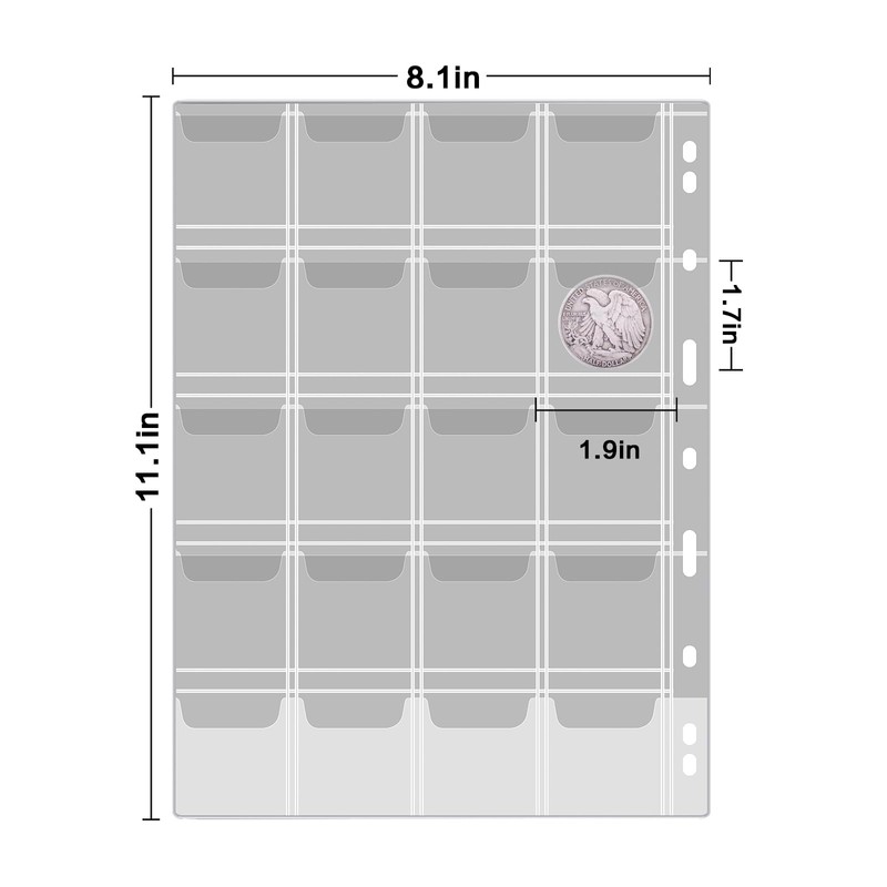 - Professional coin protection case – the coin side protection sleeve fits a variety of coins such as American Silver Eagles, Silver Bullion Coins, Challenge Coins, Morgan Dollars, U.S. Quarters, Dimes, Quarters, Gold Coins, Quarters and Pennies. Each case measures 10.9 x 8.1 inches and the slots measure 1.88 x 1.77 inches. The complete set has 12 pages and holds 240 coins.