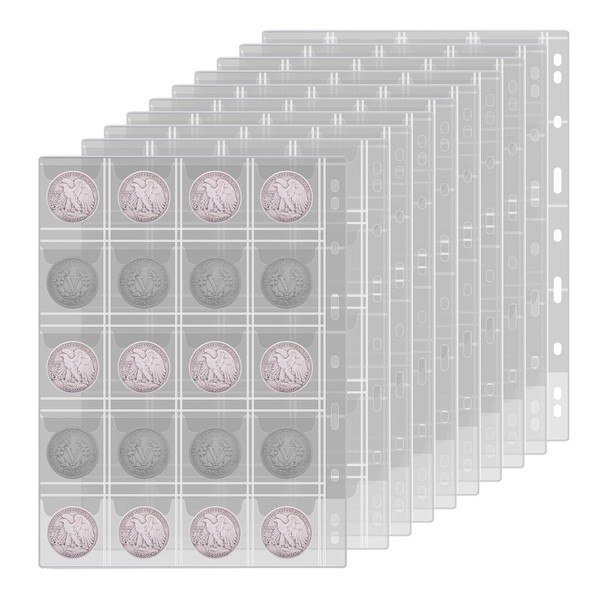 12 Sheets Coin Storage Coin Collection Pages, Coin Pocket for Coin Album, 20 Compartments 43 x 48 mm Coin Sleeves Scrapbook Coin Sheets for Euro Collector's Coins Silver Coins Commemorative Coins