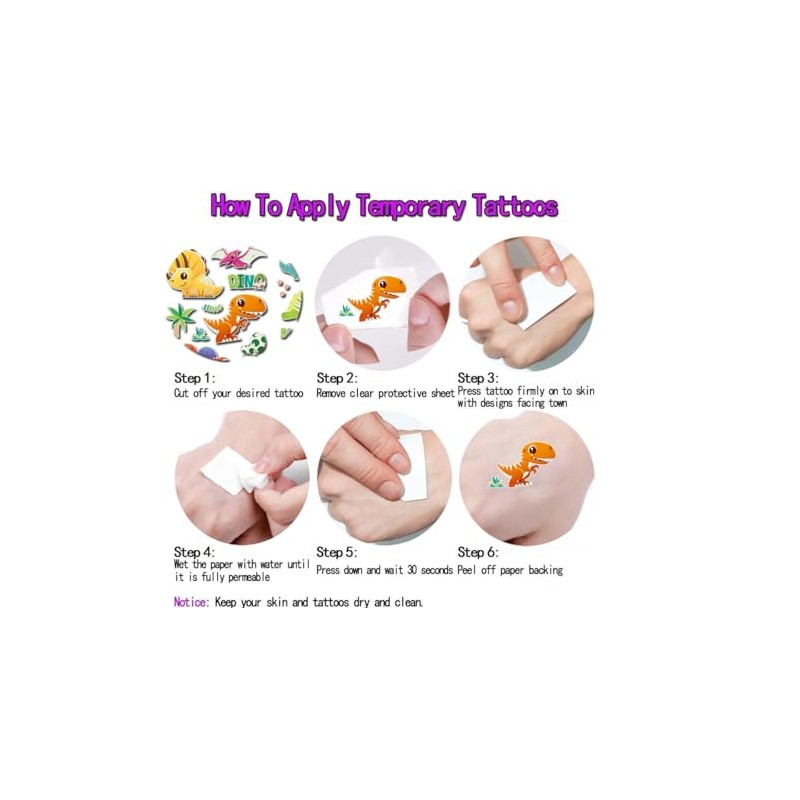 1. Clean and dry the skin where tattoo being applied. 2. Cut out the design of your choice and remove the transparent film. 3. 'Tattoo' face down on the skin firmly. 4. Wet the 'Tattoo' completely with damp cloth or sponge. 5. Remove the back paper of the tattoo after 30-60 seconds. 6. Wiping the water and the tattoo are ok.