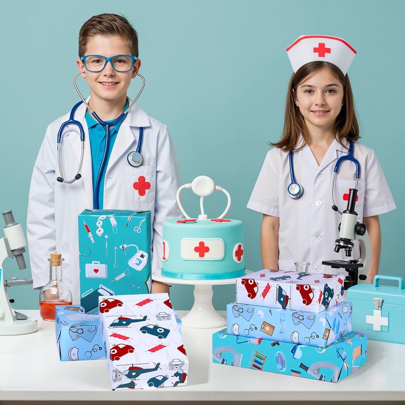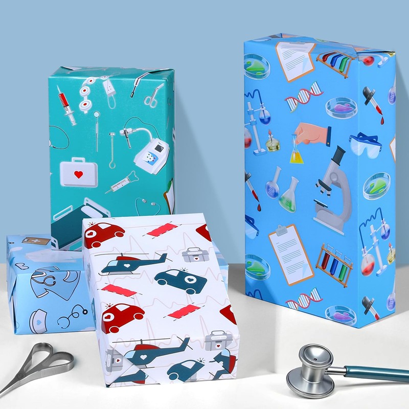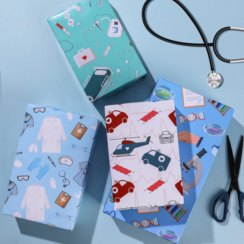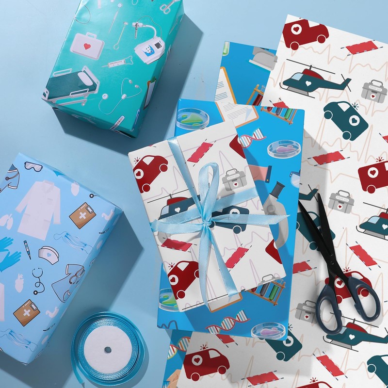 - Diverse Designs:Including 12 sheets of medical-themed wrapping paper in 4 unique designs (3 sheets per design), featuring stethoscopes, first aid kits, and ambulances motifs. Perfect for wrapping gifts with professional medical aesthetics, offering ample quantity for multiple occasions.