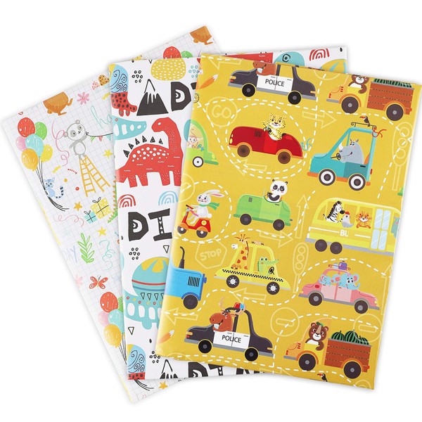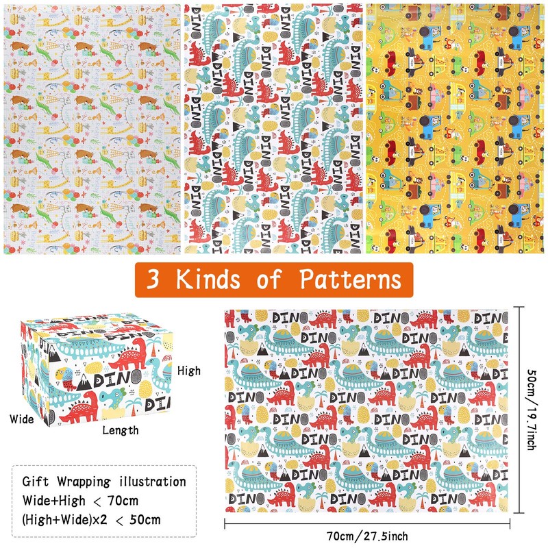 - Eye-Catchy Designs: Our kids wrapping paper has a glossy finish and vivid, bright colours, made with premium ink that ensures excellent colour stability. The set comes with different patterns, such as animals, drawings, and other cute designs that will capture children’s attention.
