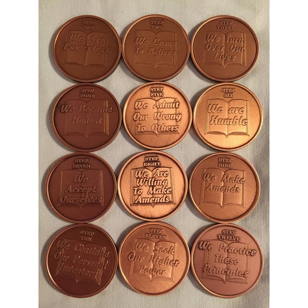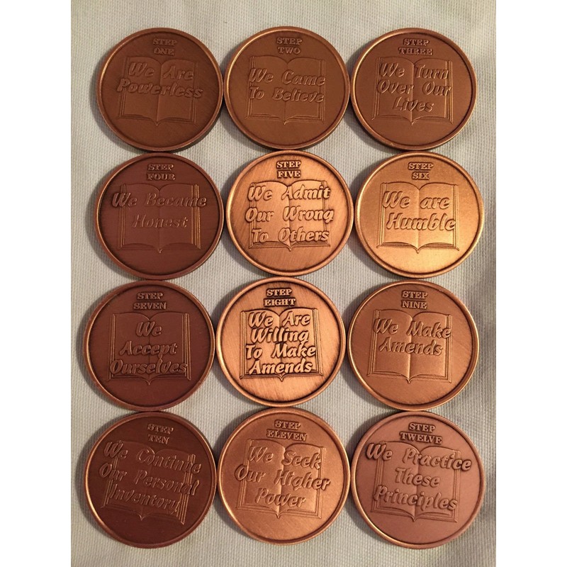 - Each features one of the 12 steps as a 3 dimensional image on a solid antique copper 12 guage coin.