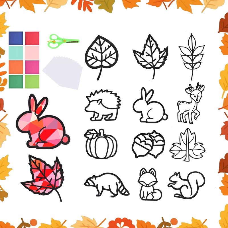 12 Stück Herbst Bastelset Kinder, Herbstdeko Basteln,Bastelvorlagen Herbst,Wiederverwendbare DIY Aufkleber Fensterbilder Blätter Deko Geschenk,Ahornblatt Eichhörnchen Igel Fuchs Kaninchen