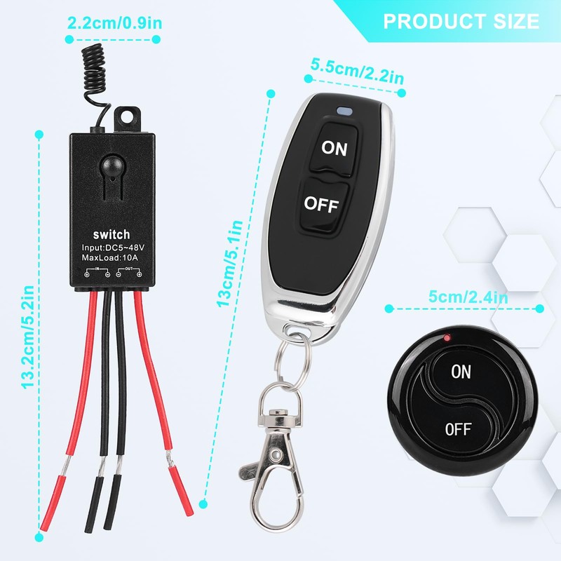 - Compact design: 12 V wireless switch, it is small and easy to install. High sensitivity, flexible control, suitable for most household appliances. Small receivers fit easily into junction boxes such as canopies, junction boxes, switch boxes. Remote control switch it is very suitable for offices, hotels, restaurants and factories. It uses wireless coding technology, does not interfere with each other and can be controlled independently.