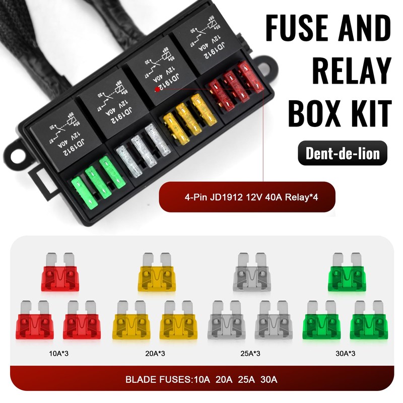 - [Multi-specification Fuse Equipment]: This automatic fuse assembly contains 12 ATC/ATO fuses, specifically3*10A, 3* 20A , 3*25A 3*30A blade fuses, which can meet diverse application needs.