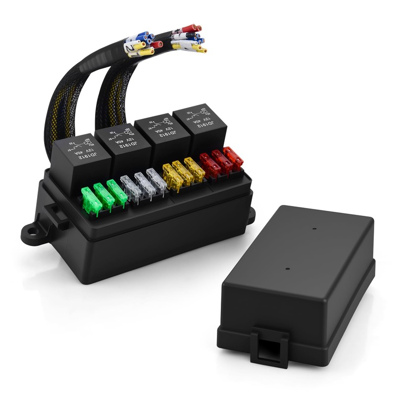- [Large Capacity Configuration]: The fuse and relay box are designed with sufficient space to accommodate 4 relays and 12 fuses. The large-capacity design allows multiple relays to be integrated into one, ensuring an orderly circuit layout.