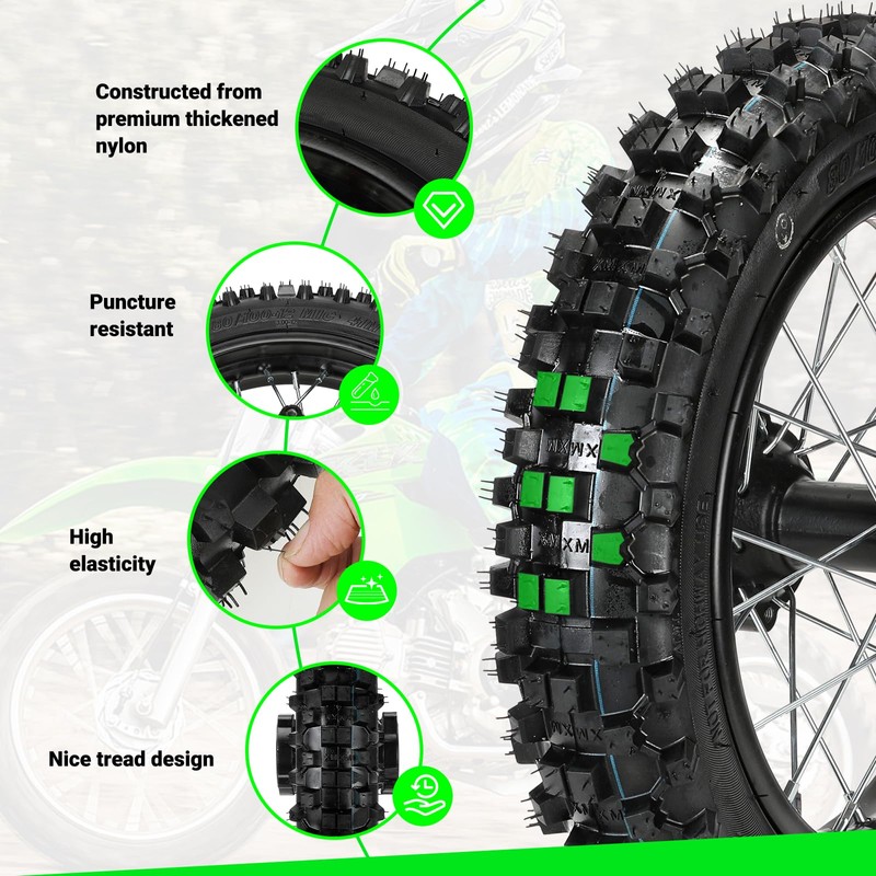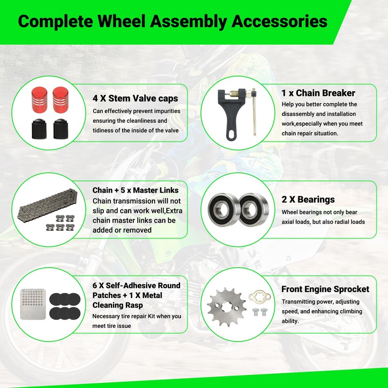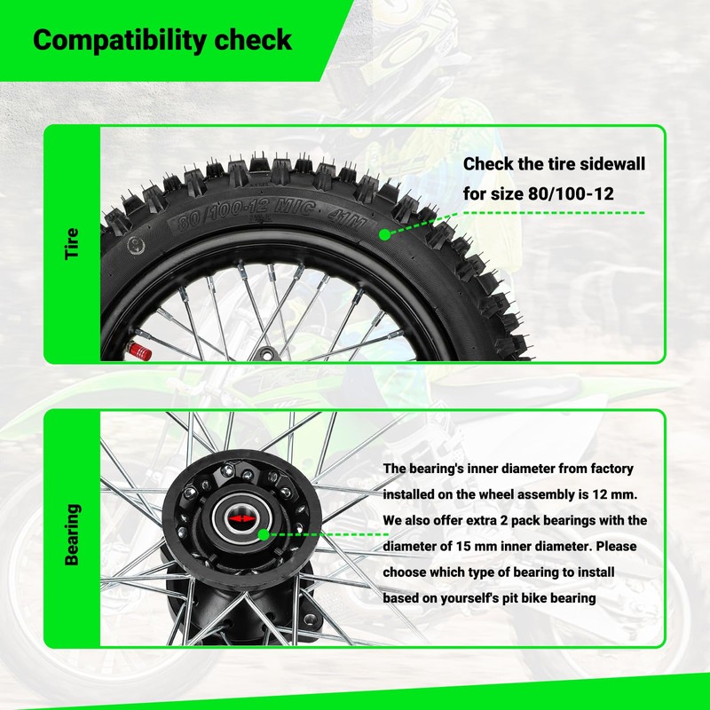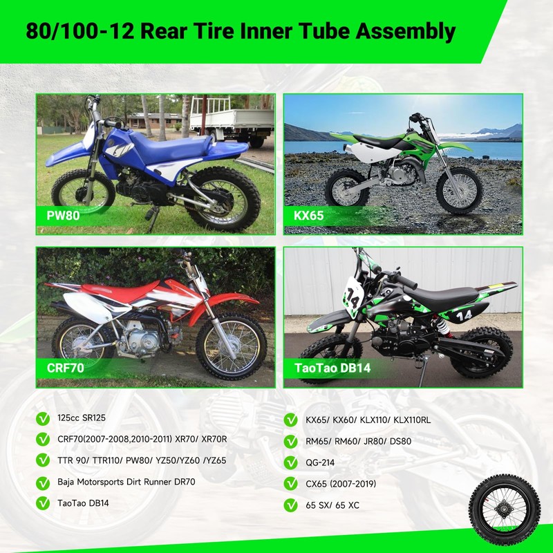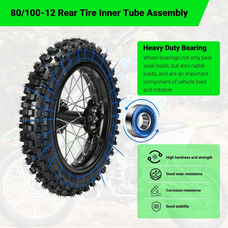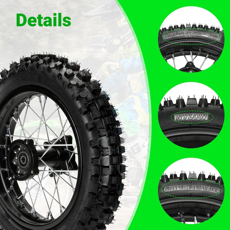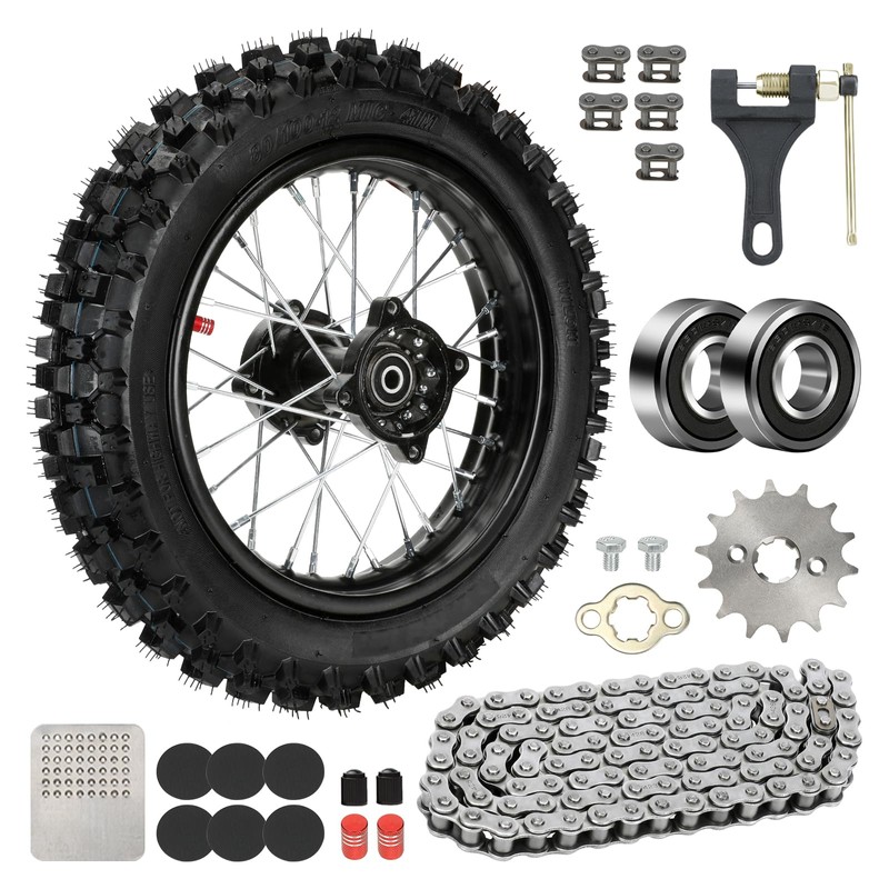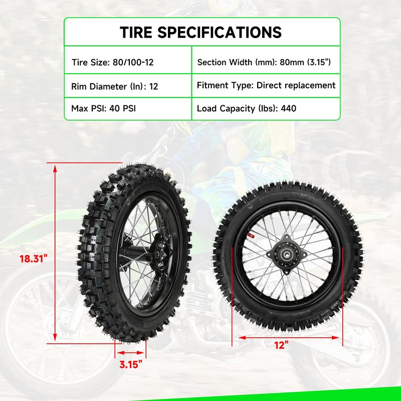 XIKOBY 12'' Wheel & 80/100-12 3.00-12 80x100x12 Rear Dirt Bike Tire Rim for 125cc 110cc SSR CRF110F PW80 TTR110 KLX110 KLX110L KX65 DS80 JR80 Baja DR70 Off Road Pit Bike Parts with 428 Chain