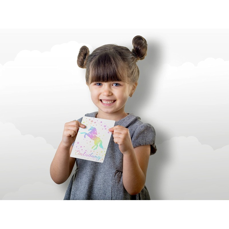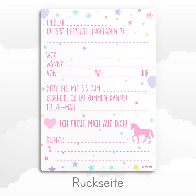 - Magical - The popular invitations from Brint with real glitter make girls' hearts beat faster. Let yourself and all your friends be enchanted by this beautiful unicorn in the rain of the stars, and a fantastically beautiful party is sure for you.