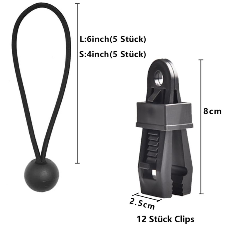 12 x tarpaulin clips, heavy duty with 10 x tarpaulin tensioners with ball, camping, tent clip, tarpaulin clips, linoleum clip, tent clips, plastic, tarpaulin