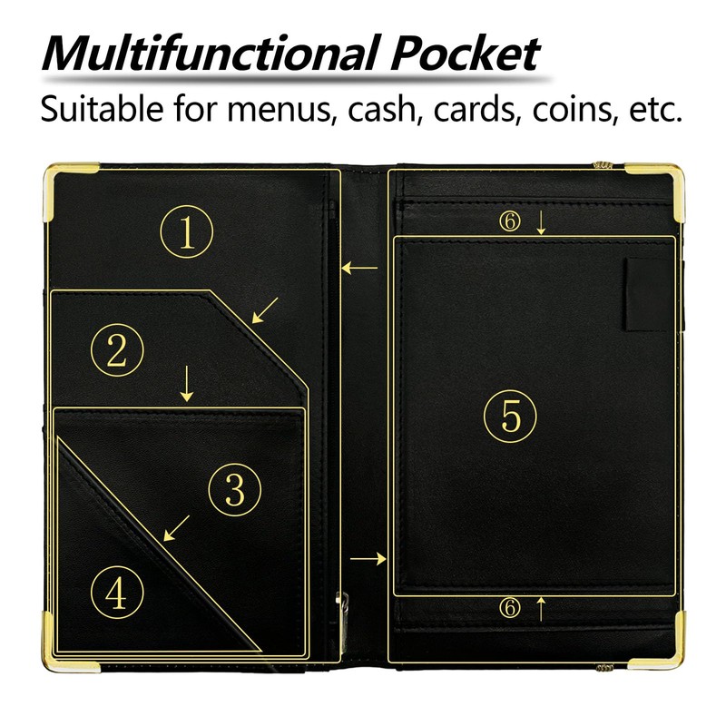 - Perfect Outer , Interior Design:The guest book has a smooth and flat surface for the waiter and waitress to order and write. Internally, considering the different payment methods of people, 7 different parts are designed, which are very suitable for storing credit cards, menus, bills, coins, dollars, order paper, etc. The design of the pen holder also facilitates the use of the waiter.