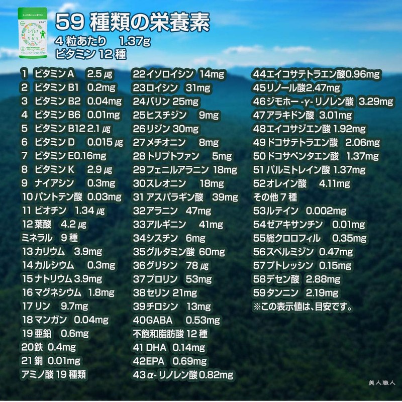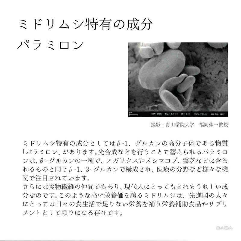 - 原材料:ユーグレナグラシリス粉末(国内製造)、ローヤルゼリ-、有胞子性乳酸菌、食用精製加工油脂/ゼラチン、ラクトフェリン濃縮物(乳由来)