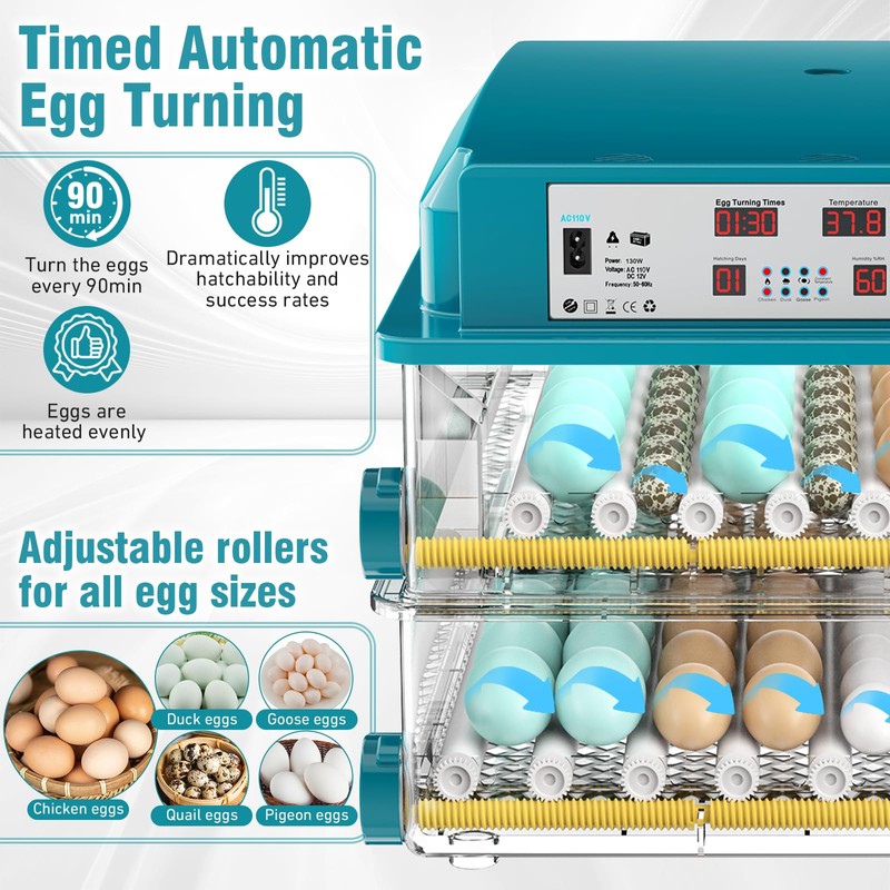 - HATCHES A VARIETY OF EGGS: The distance between the rollers can be adjusted to fit different kinds of eggs, can hatch eggs, duck eggs, pigeon eggs, quail eggs, and other sizes of eggs.