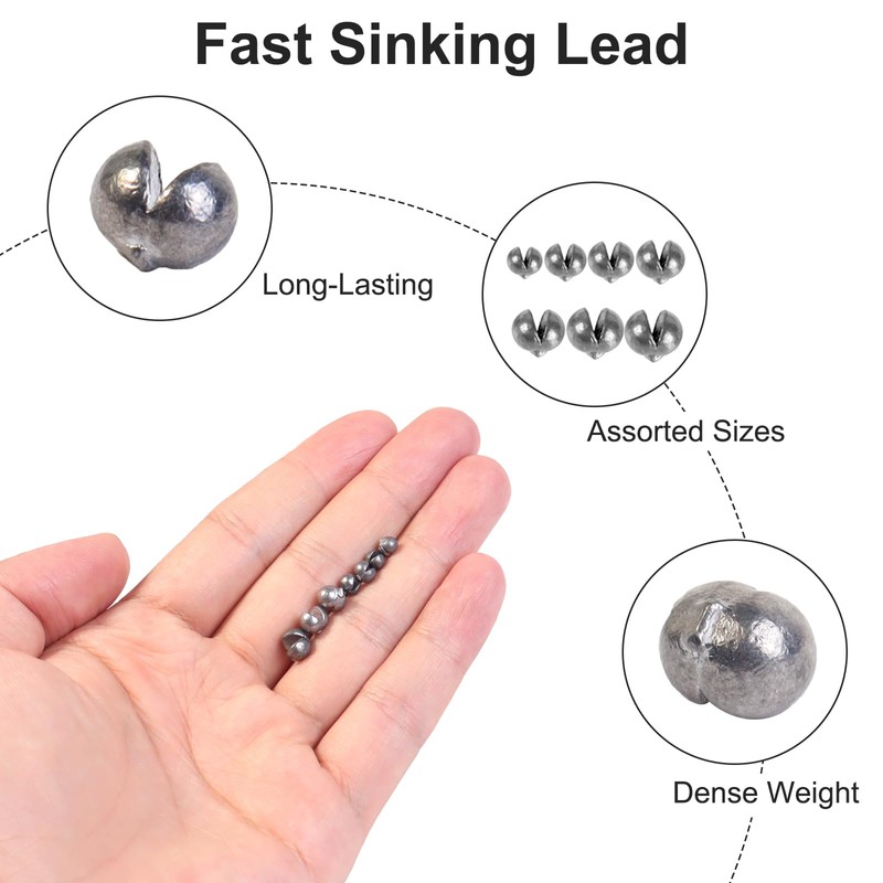 • 120G split shots: Enjoy a comprehensive fishing lead shot set with our package that contains 120 g precision lead split shots with a weight of 0.4 g to 1.5 g and provides the perfect balance for your fishing needs. The split shot fishing weights also comes with 2 worm baits to improve your fishing experience.