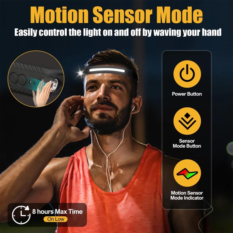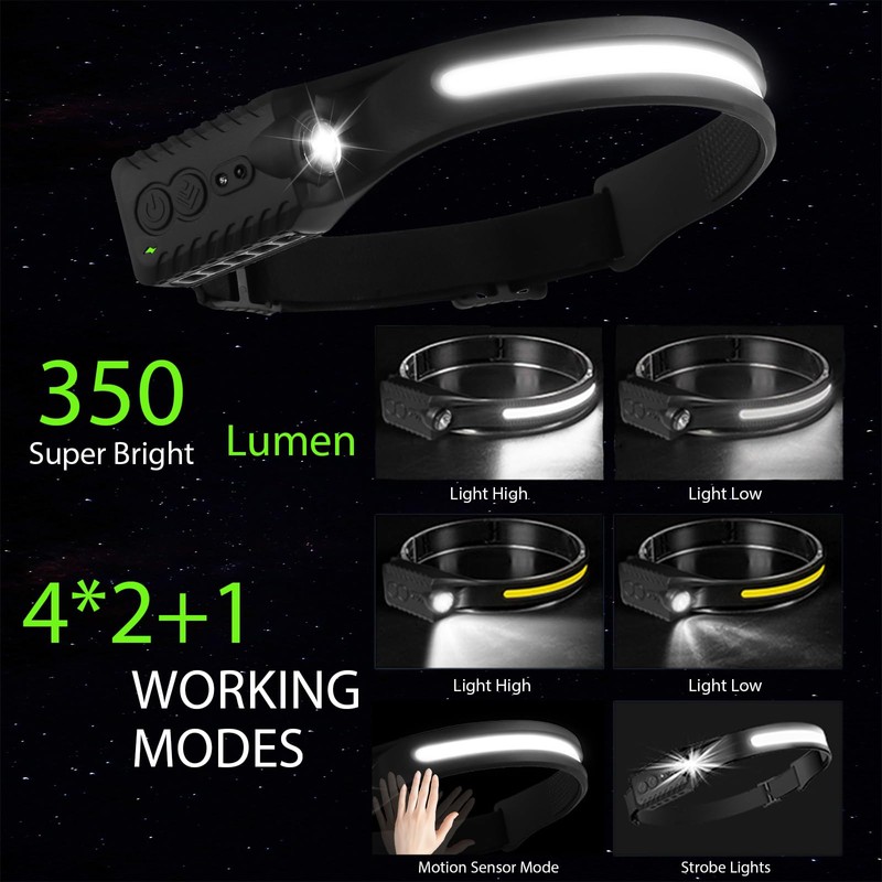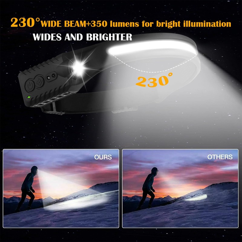 1200mAh Rechargeable Battery Headlamp Flashlight, Night Fishing Headlight for Buddy Adult Forehead Camping Outdoor Running, 350Lumens Led Headlamp 230 Wide Beam Adjustable Headband, Wave Motion Sensor