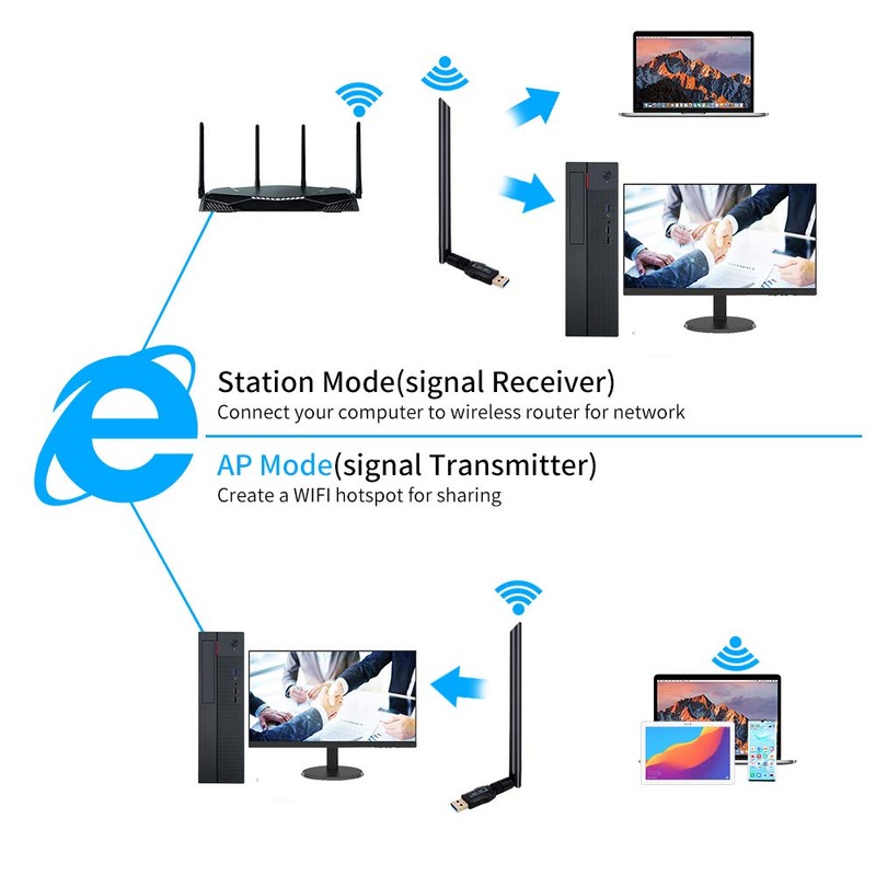 - Soft-AP mode: Wireless internet>>WiFi hotspot.Wirelss USB adapter connection to PC or Laptop with wireless internet ,Set AP mode and offer Wi-Fi singla to mobile devices.
