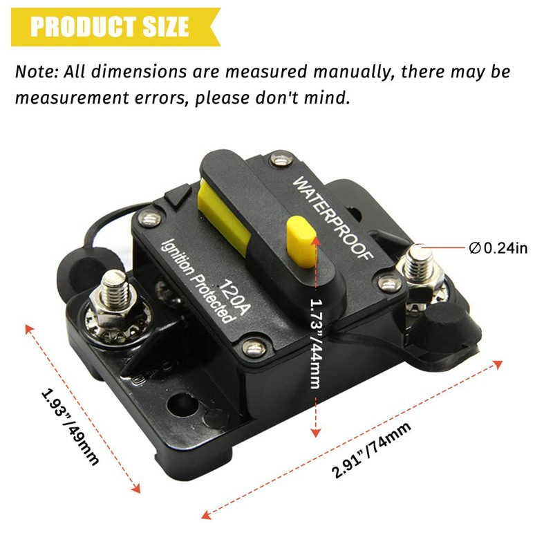 • Specification: Compatible with all 120A, 12-48V breaker switch, yellow Manual Reset Button, for Automotive Marine Boat Audio System Current Overload Protection.