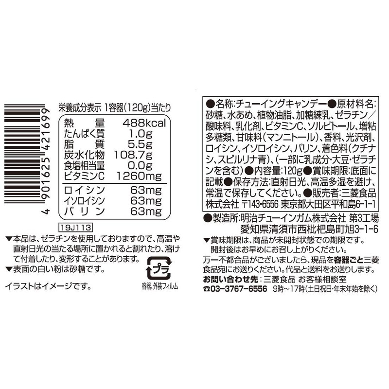 - 原材料:砂糖、水あめ、植物油脂、加糖練乳、ゼラチン/酸味料、乳化剤、ビタミンC、ソルビトール、増粘多糖類、甘味料(マンニトール)、香料、光沢剤、ロイシン、イソロイシン、バリン、着色料(クチナシ、スピルリナ青)、(一部に乳成分・大豆・ゼラチンを含む)