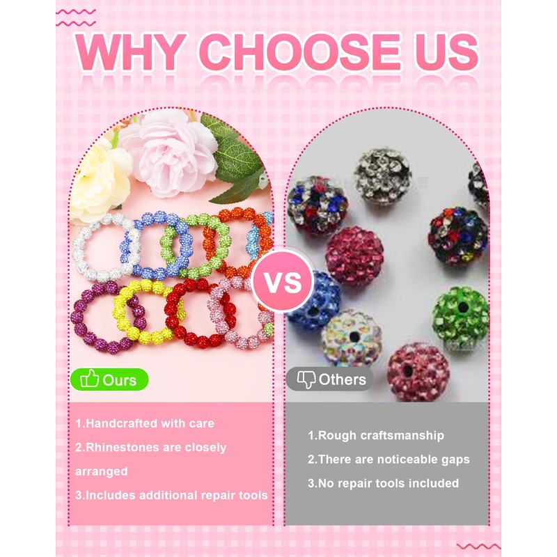 • Premium Quality Handmade Craftsmanship: Each bead is meticulously made from polymer clay and embellished with vibrant rhinestones, closely arranged to create a brilliant shine. The tight placement of the rhinestones maximizes light reflection, adding extra sparkle to your jewelry designs. Perfect for creating eye-catching, shimmering pieces.