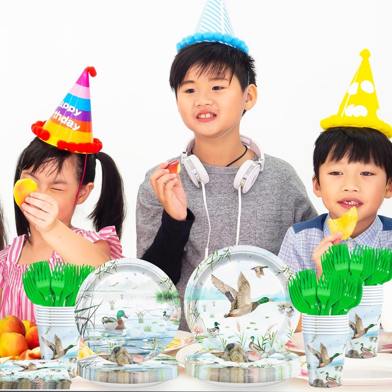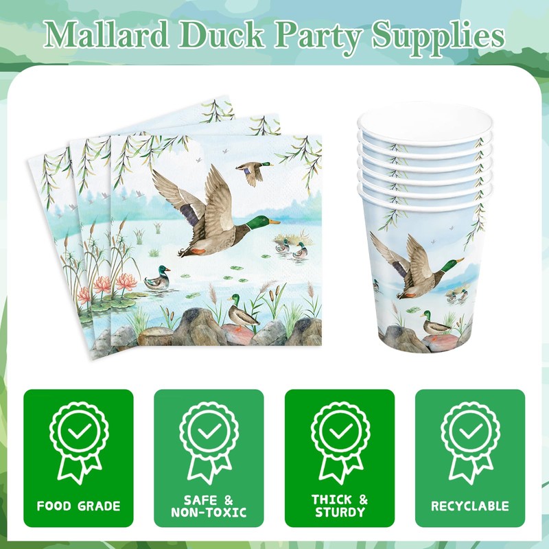 - Mallard Duck Party Supplies: You will receive 120pcs mallard duck plates and napkins tableware set includes 24pcs 9" dinner plates, 24pcs 7" dessert plates, 24pcs napkins, 24pcs paper cups, 24pcs green forks. Meet your needs of holding party with families and mates.