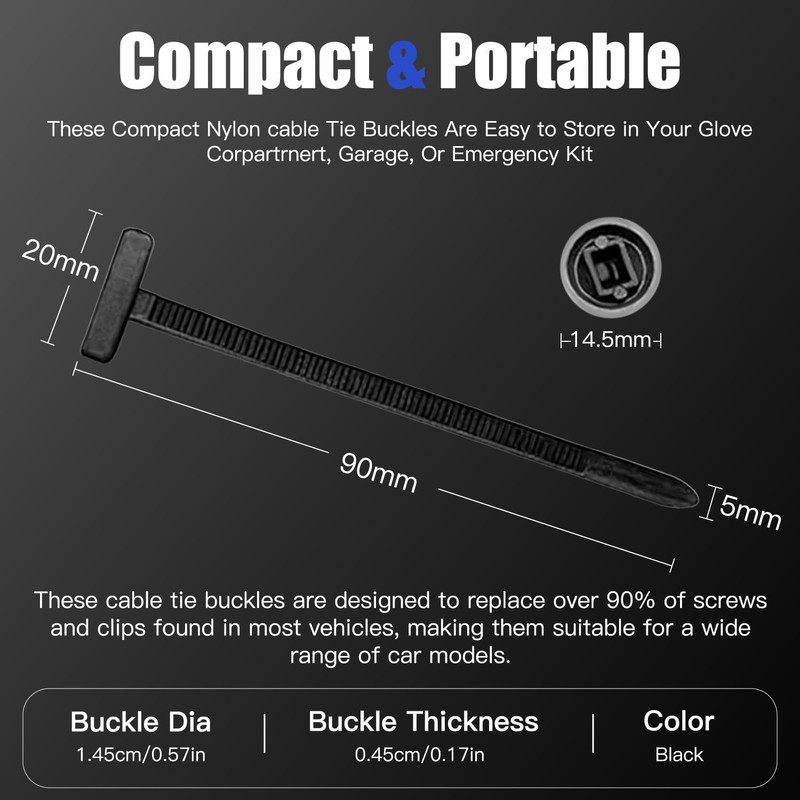- 【 Universally applicable to 95% of vehicles 】 : These nylon universal cable ties are specially designed for the daily maintenance needs of automobiles. These nylon cable ties are the great choice for securing mudguards, trunk linings, engine hood and body floor, providing a reliable alternative to traditional screws and clips. They are particularly suitable for emergency bumper clips or DIY garage repairs.