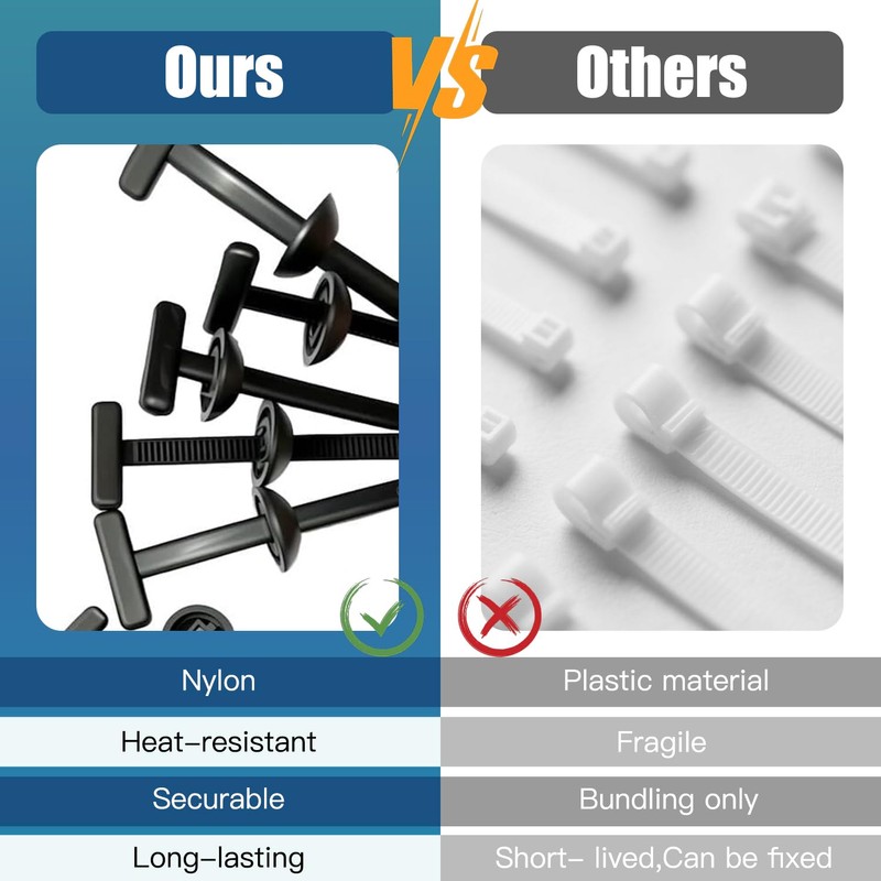 - 【 UV-Resistant Cable Ties 】 : Made of high-strength nylon, these cable tie buckles can resist ultraviolet rays, withstand rain, high temperatures and daily wear and tear, and have reliable indoor/outdoor performance. Industrial-grade nylon cable ties can withstand harsh environments, are flame-retardant and highly resilient, and maintain good performance at temperatures ranging from -40 to 266°F.