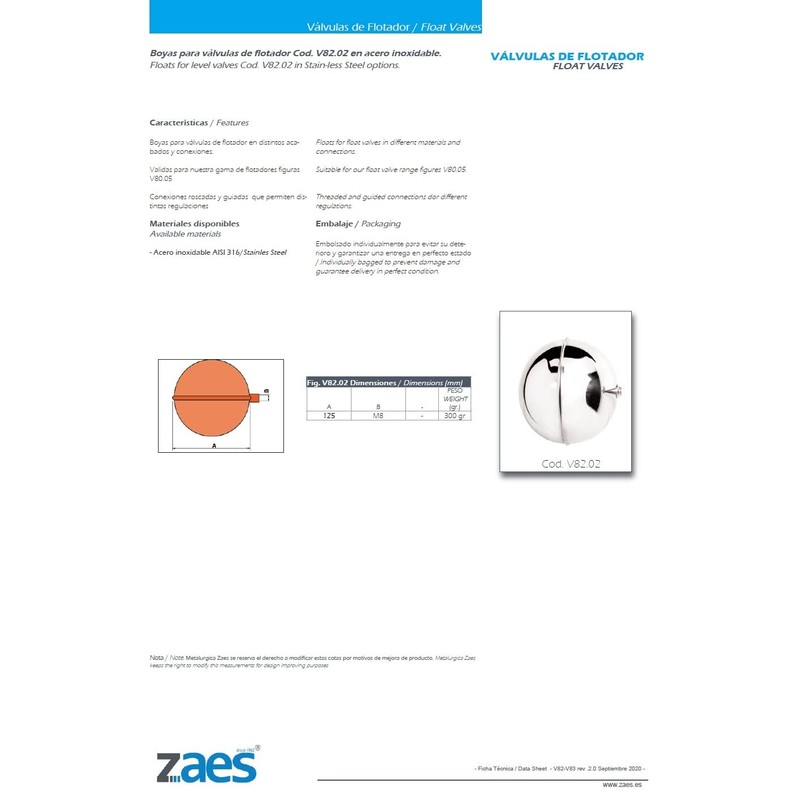 • Valid for our figure range V80 floats in stainless steel AISI 316 with threaded connection with metric internal thread.