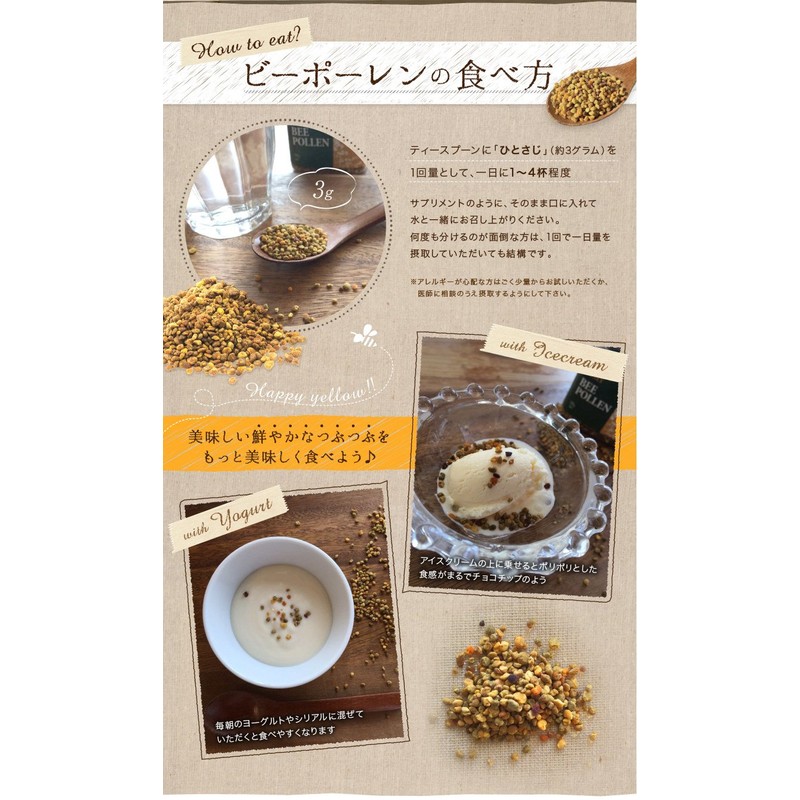 - 【ビーポーレン おすすめのお召し上がり方】ビーポーレン をお水と一緒に/ ビーポーレン を毎朝のヨーグルトやシリアルに/ ビーポーレン をハチミツと混ぜて