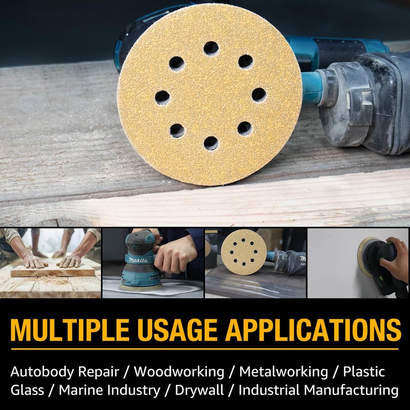 - 【Wide Application】 5 sanding discs can be used for grinding and polishing wood, aluminum alloy, fiberglass, rubber, stone, painted surface, plastic and non-ferrous metal, suitable for a variety of grinding needs. Perfectly adapted to 5-inch random orbital sander, suitable for both professional and home use.