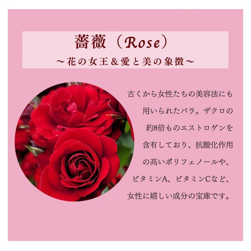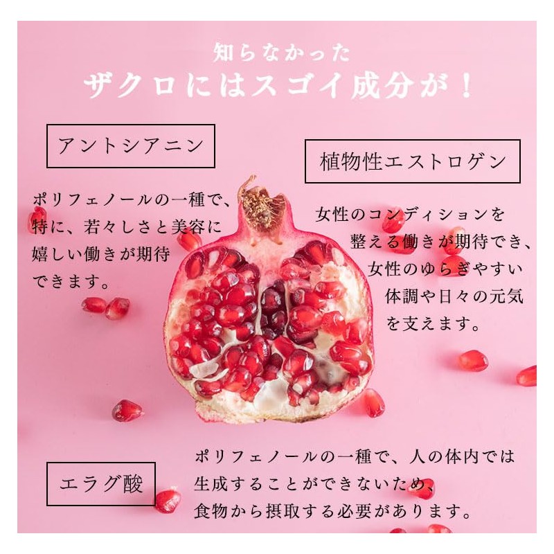 - 女性に嬉しい成分が豊富に含まれる、ザクロとバラを原材料に使用しています。