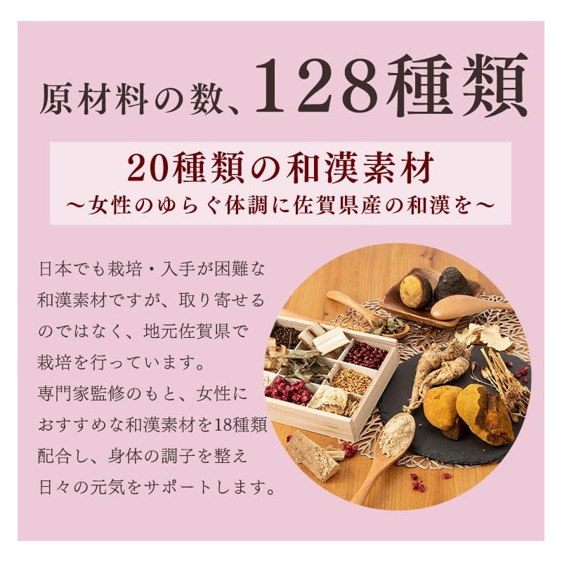 - 128種の和漢植物を含むすべての植物性原材料が国内産(佐賀県産)です。