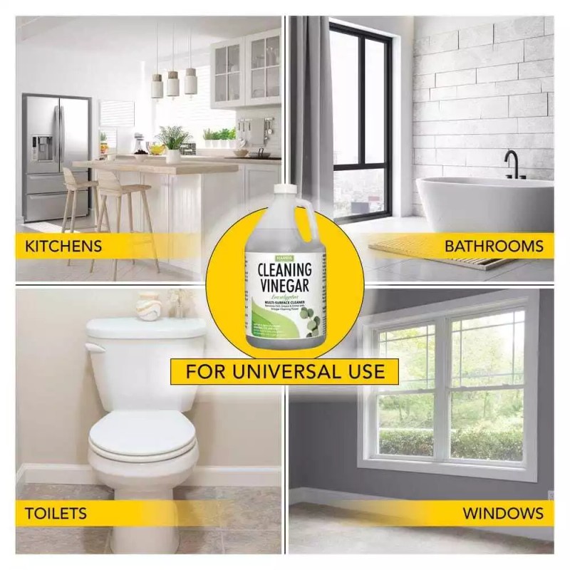Cleaning Vinegar cleans and leaves behind a refreshing Eucalyptus scent. The vinegar removes dirt, grease and grime safely from most household surfaces. Use on stainless steel, ceramic, glass and much more. For use in kitchens, bathrooms, and more on windows, showers, toilets, etc. Your "go-to" all purpose cleaner. Can be diluted 7 to 1 for everyday cleaning.