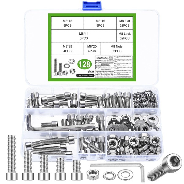 - Versatile: a total of 128 hexagon socket screws set, including M8 screws in different lengths, nuts, washers and spring washers, are included. The universal tool for DIY maintenance and assembly.