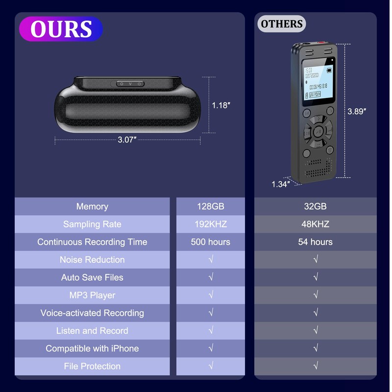128GB Digital Voice Recorder - Audio Recorder 1600 Hours Recording Capacity Audio Recording Device MP3 Records with 500 Hours Battery Time for Work,Lectures, Meetings, Interviews