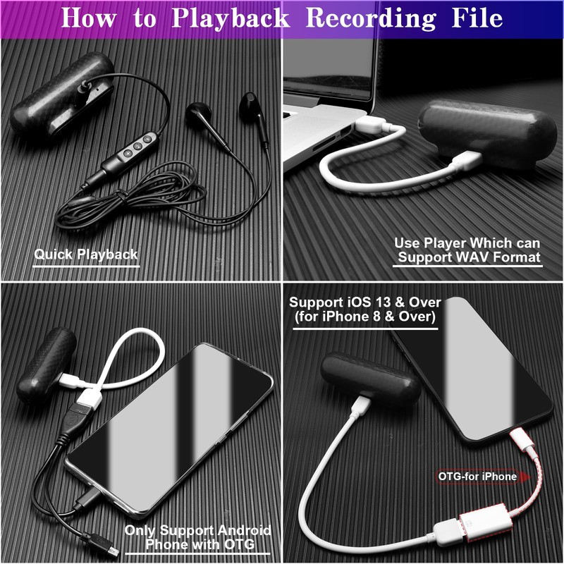 - ✔️【No Need Connect With Computer】- With OTG function,you can easy file management on your phone or PC. With the Type-C / Micro-USB adapter/ OTG adapter,you can quickly or transfer/play/ manage recording file quickly via computer or Android phone or iPhone which with OTG function.