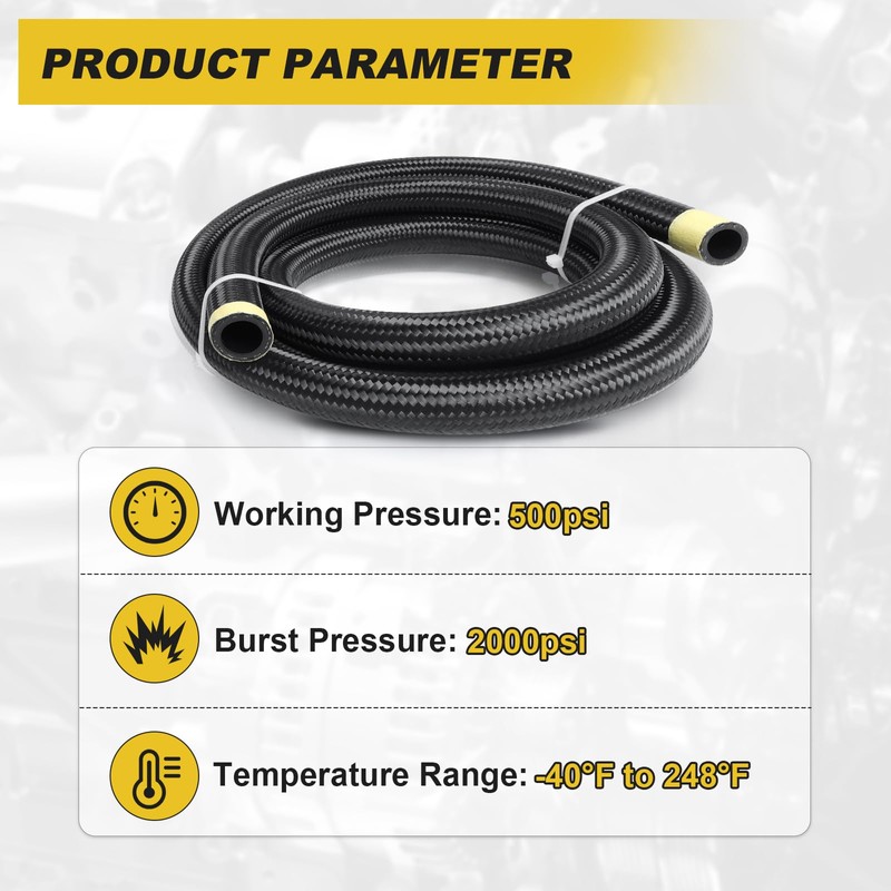 - 【Material】The inner layer of the braided fuel hose is made of premium CPE rubber, and the outer layer is a braided layer composed of 304 stainless steel wire and nylon. It has high strength and excellent durability